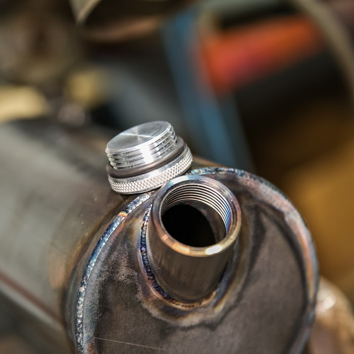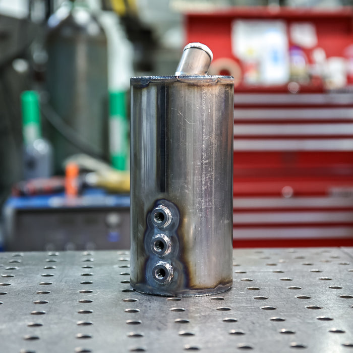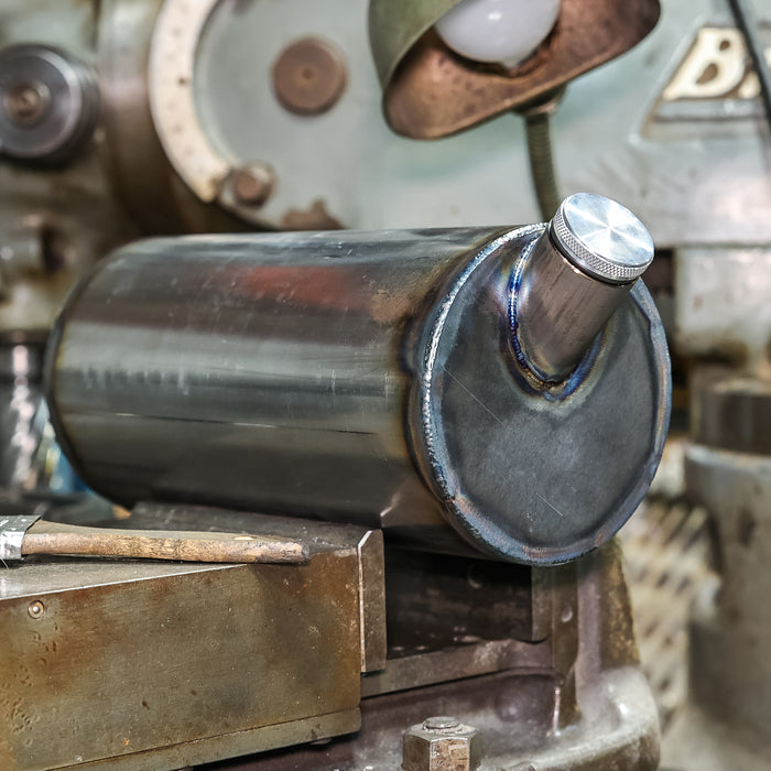This Universal Barrel style chopper oil tank, is built in house at Throttle Addiction. It's 100% TIG welded out of 14 gauge steel tubing. This is a universal fit oil tank, which requires you to fabricate your own mounting points. We recommend welding on threaded bungs to the tank or dog ear style tabs. It has three 1/4" NPT bungs for your hose fittings. This custom barrel oil tank works great with our Throttle Addition hardtail kit, but will fit any frame you desire. Aluminum thread-in cap included.