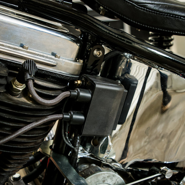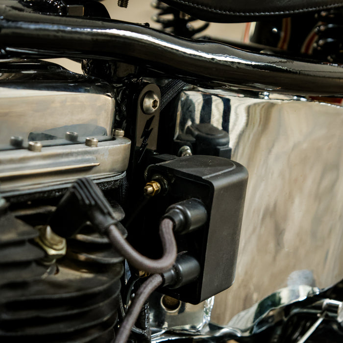 This coil mount from Throttle Addiction is designed to fit Harley Davidson Panhead, Shovelhead, Evolution, Big Twin frames. They will bolt directly up to the bungs mounted on the seat post tube. The coil mounts are precision cut from 3/16” mild steel and CNC bent.