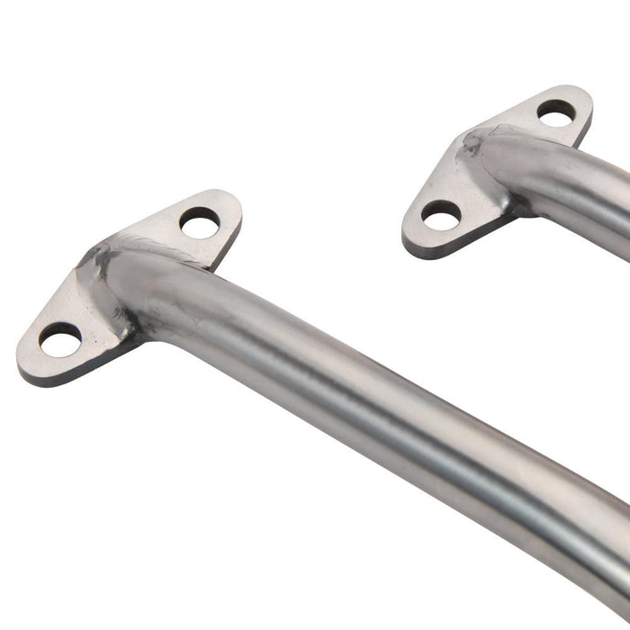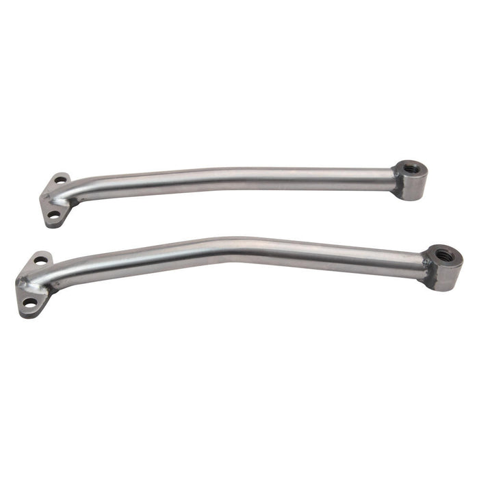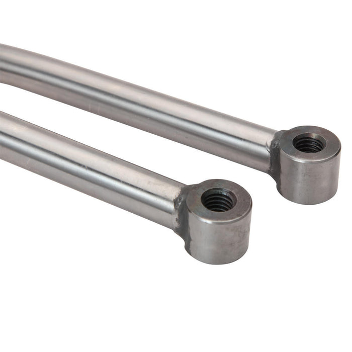 Chrome hardtail fender braces measure 9.5" tall and feature 5/16" threaded mounting bosses.  One brace has a more drastic bend to account for clearing the brake.  work great on fenders that have a larger side wall.