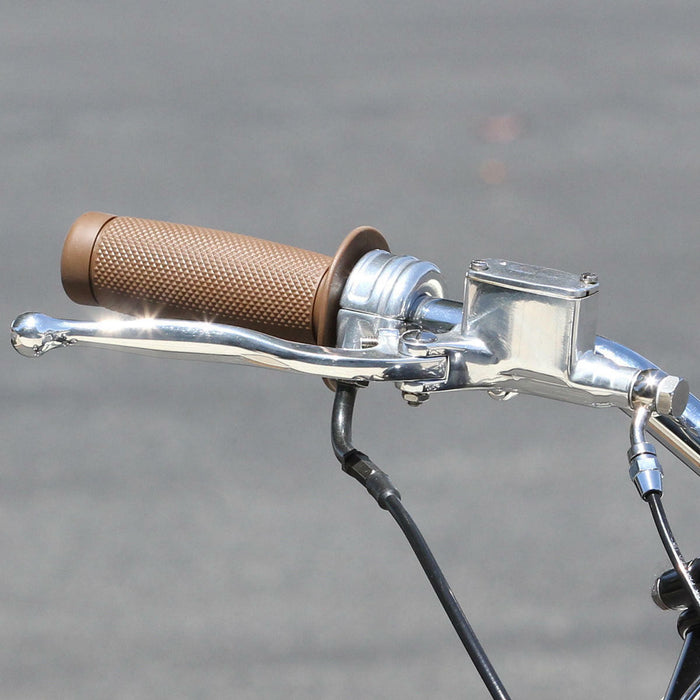 Made of injection-molded Krayton synthetic rubber, this is the same soft material used in motocross grips of bicycle grips. It's very comfortable but will wear faster. Chocolate color.