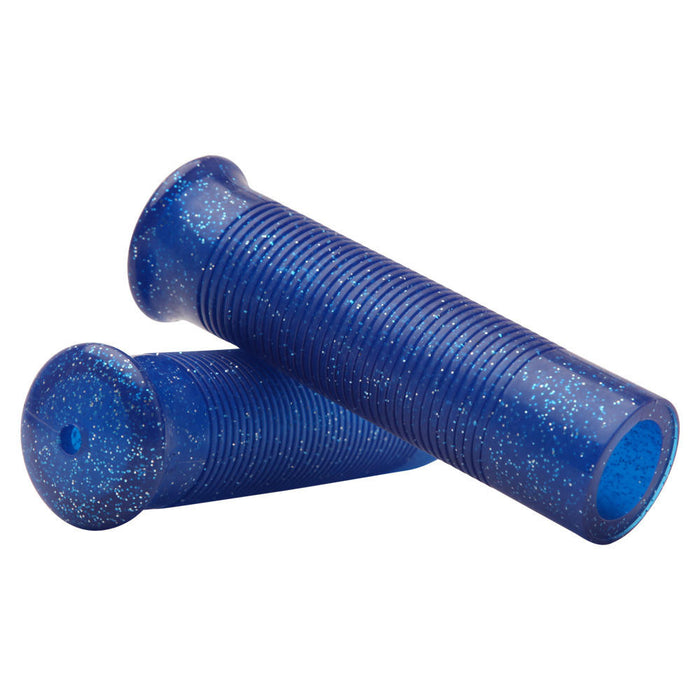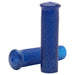 Blue metal flake motorcycle grips for 1" handlebars using an external throttle sleeve. Set includes one 1" grip for clutch side, and a 1 1/8" grip to fit over the external throttle sleeve. Grips are constructed of a semi soft synthetic compound.