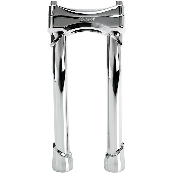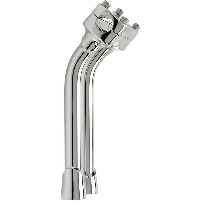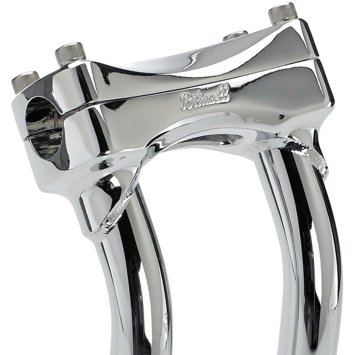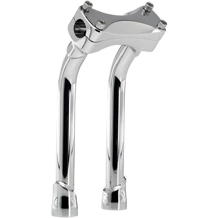Overview: Murdock pullback risers are available in 8, 10, and 12 inch heights with 2” of back sweep. All Murdock risers feature investment-cast steel top clamps and lower threaded bases. They are connected by two 1-inch O.D. x 0.120” (3mm) wall seamless 4130 chromoly tubes. After TIG welding the finished unit is hand polished and triple chrome or satin black plated for style and durability. The threaded bases on Murdock risers are on 3.5” (89mm) centers to fit most stock and aftermarket H-D triple trees with removable bar clamps. Of course, the bolt pattern on these riser’s one-piece handlebar clamp fits most stock H-D speedo and tach brackets.