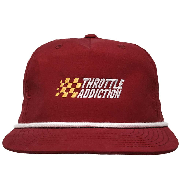 This red snapback hat is embroidered in Eau Claire WI, and features our Finish Line Logo embroidered in yellow and white.