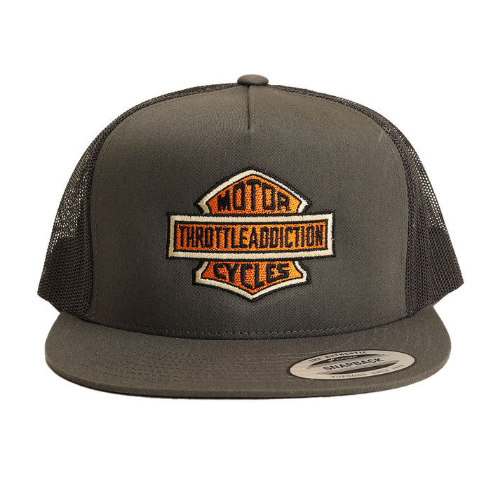 This hat features the Unit Triumph motor on a Black YP Classics 5 panel trucker cap.