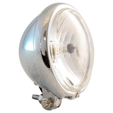 Classic Bates style headlight features blue dot high low beam indicator. This motorcycle headlight is constructed of steel and features a glass lens. It uses a H4 halogen bulb which has no problem lighting up the road. It’s a great clean option for replacing a stock headlight and fits perfect between narrow and wide glide front ends.