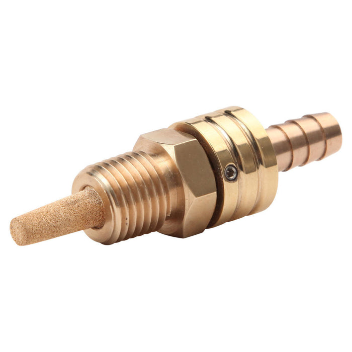 Prism Motorcycle Supply manufactures these unique petcocks in the USA. This brass petcock fits 1/4" NPT bungs on your gas tank. It features a 5/16" diameter hose barb on one end and a fuel filter on the other. Rotating the cylindrical piece with the two grooves is how the fuel is toggled on and off. The fuel line will not and does not rotate while toggling the fuel on/off.
