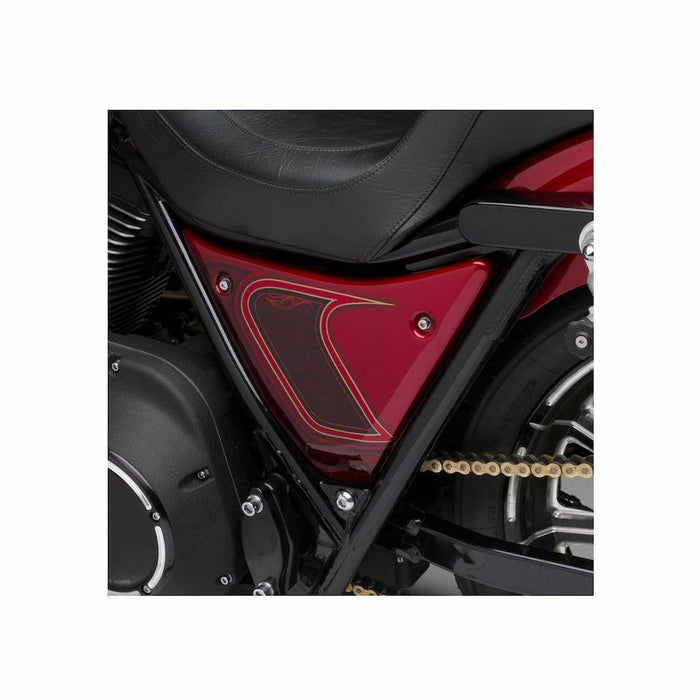 These FXR side covers from Arlen Ness add a smoother look to your frame while providing more area to continue your paint scheme. Made of durable ABS plastic, these covers are designed to mount to the rear side panels. Sold unpainted and in pairs.