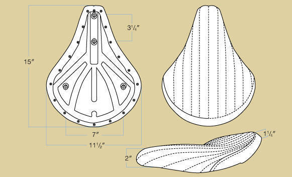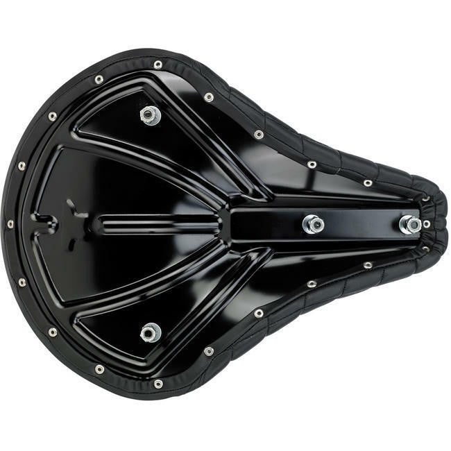 Construction: Heavy gauge stamped steel pan with gently sloping rear kick for added support. Stamped-in ridges on the pan increase stiffness and give the pan a clean, classic look. Matte black electroplated finish. Cover is hand stitched heavy-duty vinyl and is fastened to underside of seat pan with rivets for durability. Foam is molded polyurethane, approximately 1" thick.