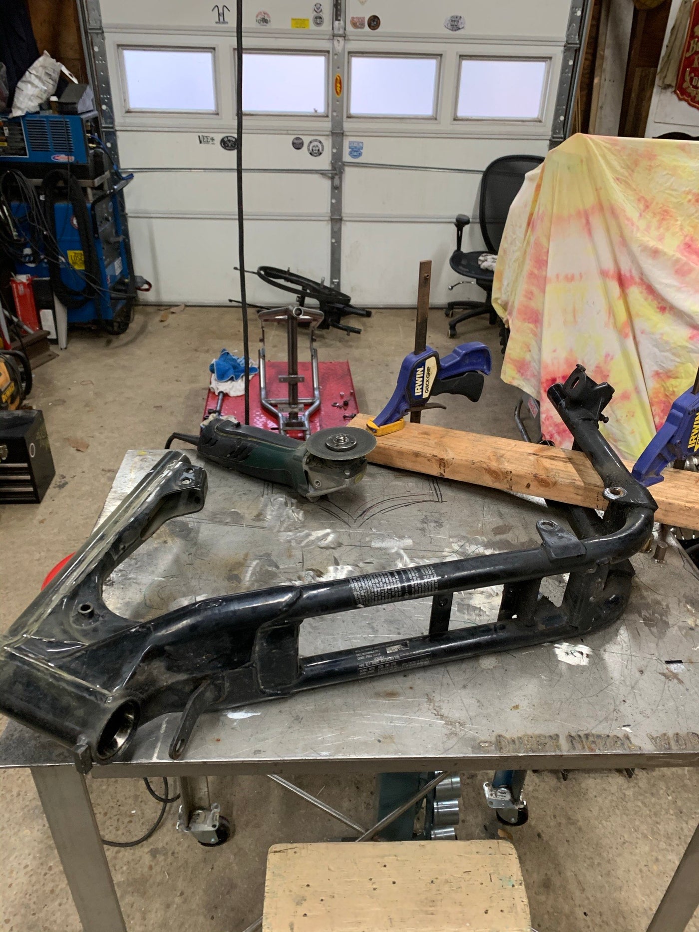 Front End: Mullins Chain Drive Super Narrow Triple Trees, Stock Showa 39mm Lowers, Shaved and Sanded. 6" over tubes.