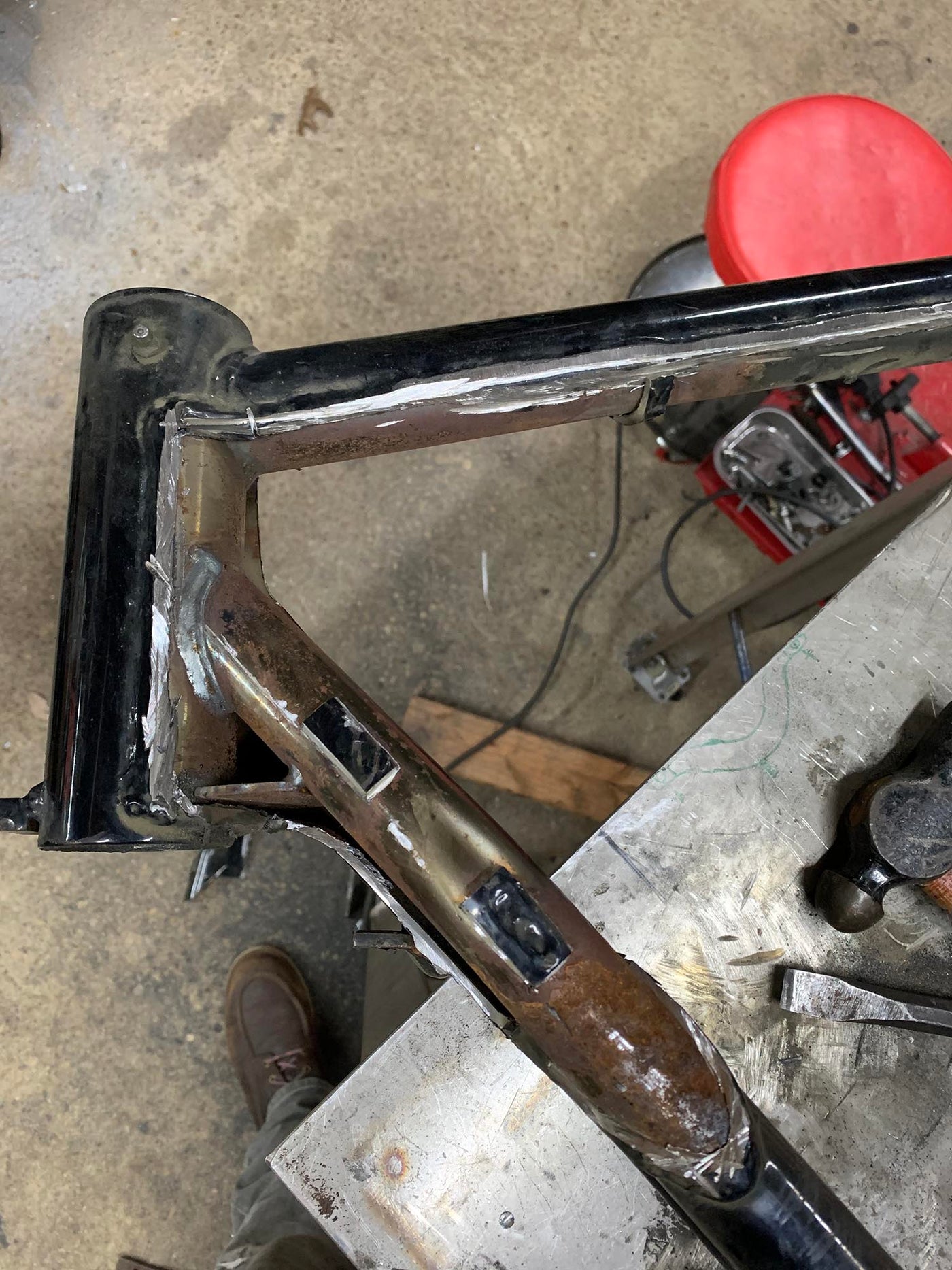 Paul also took the time to go all in on the front end of the stock Sportster frame. He started by removing the factory sheet metal neck gusset. Once this is out it reveals some clean frame tubes. However, the work has just begun because it requires extra reinforcement, installing a cross tube, installing smaller front gussets, as well as replacing the stock frame top motor mount with a custom tab. The work is worth it though, as it provides a killer looking custom frame, all while keeping your stock VIN.