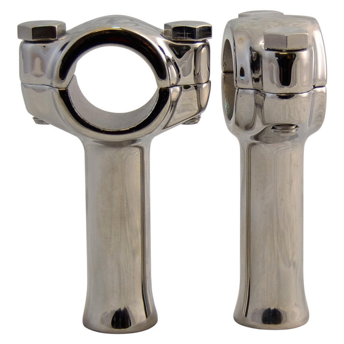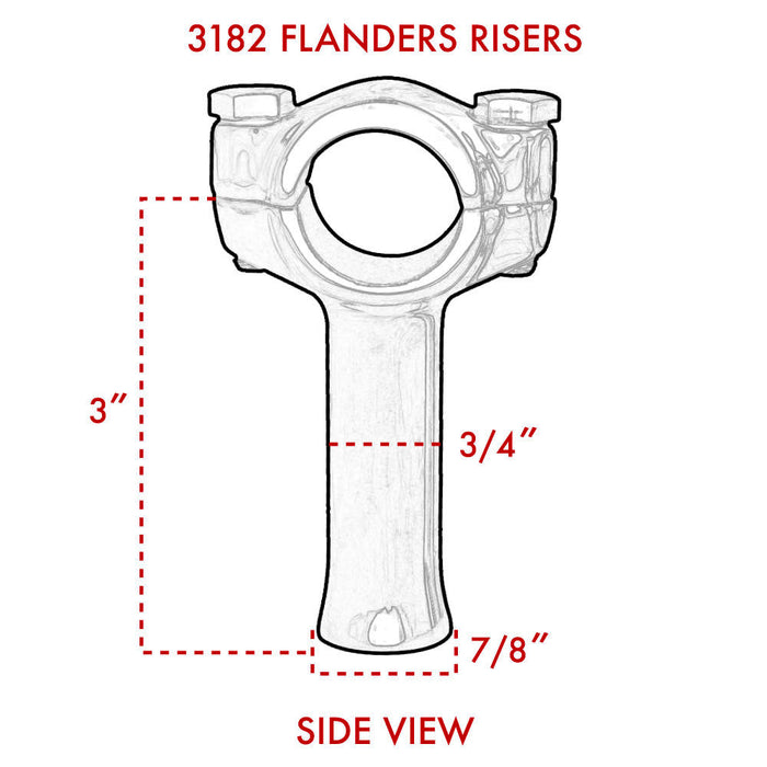 Throttle Addiction Flanders style risers are constructed from cast stainless steel and polished to a mirror shine. These require ½” X 20 TPI mounting bolts and work with 1" handlebars.