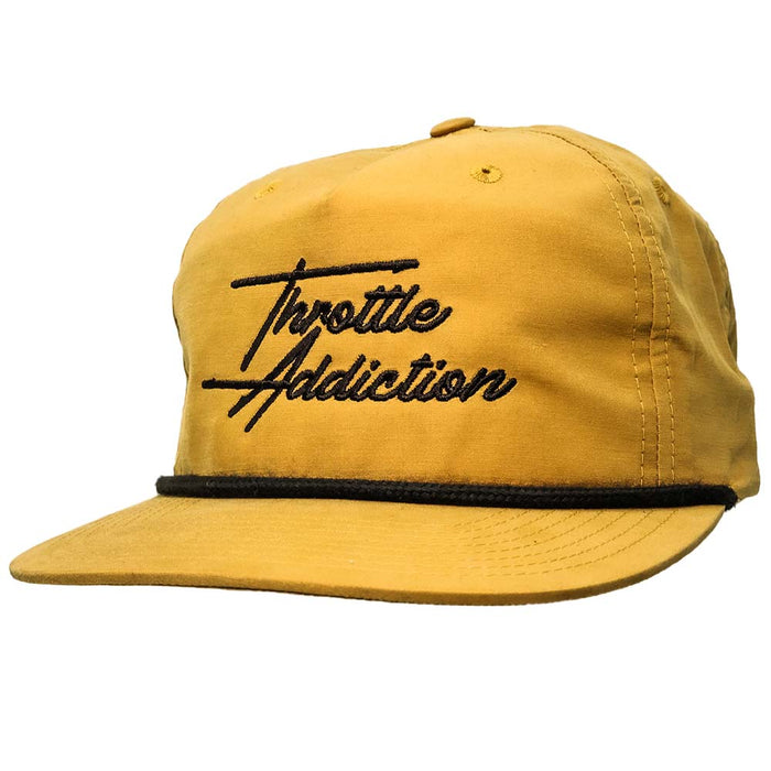 This Mustard snapback hat is embroidered by us in Eau Claire WI, and features our Script Logo embroidered in Black.